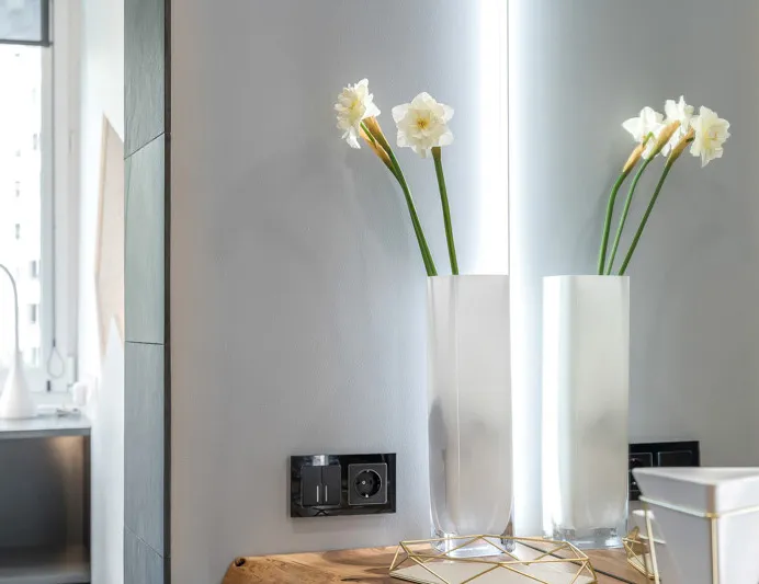 Обновленный интерьер дополнили высококачественные механизмы и рамки Werkel™, которые стали важной частью дизайна. Эффектные прямоугольные рамки серии Favorit из закаленного стекла с полированной кромкой гармонично сочетаются с эргономичными выключателями. Благодаря замкам EasyClick, механизмы легко соединяются с рамками, что значительно упрощает процесс установки.